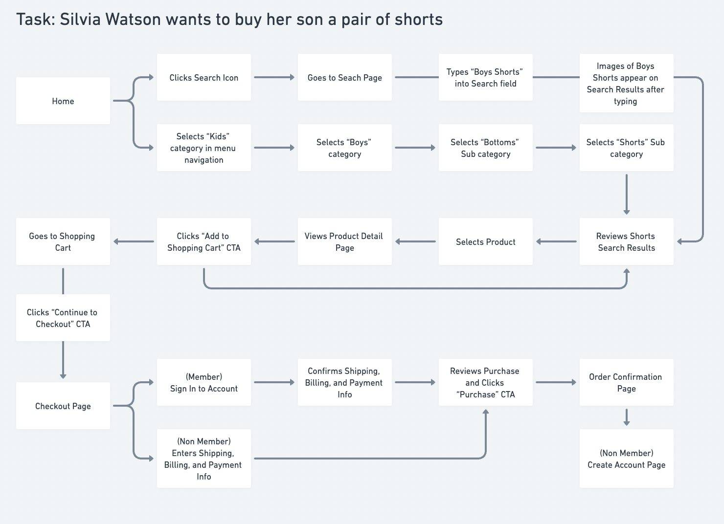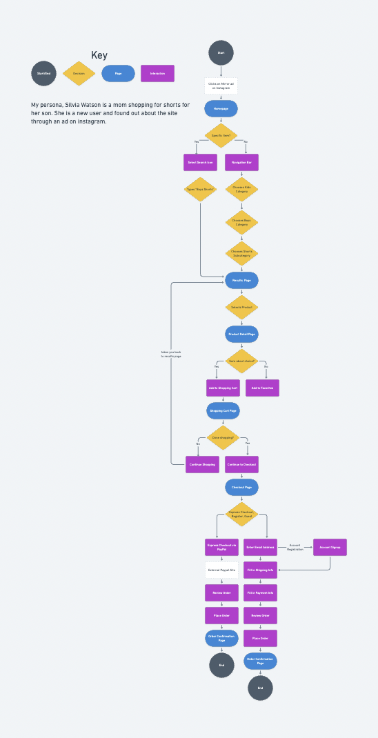 Keeping Silvia in mind, I created a task flow where she could purchase a pair of shorts for her son using the search function, or the menu navigation. I also created a user flow in which Silvia arrives at the Minnow website from an Instagram ad. In order to make a purchase on the website, she would be given the opportunity to checkout via Paypal, register as a member, or checkout as a guest.